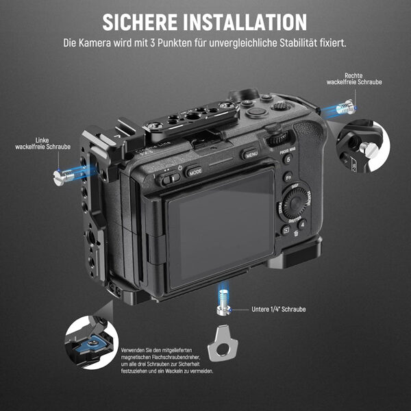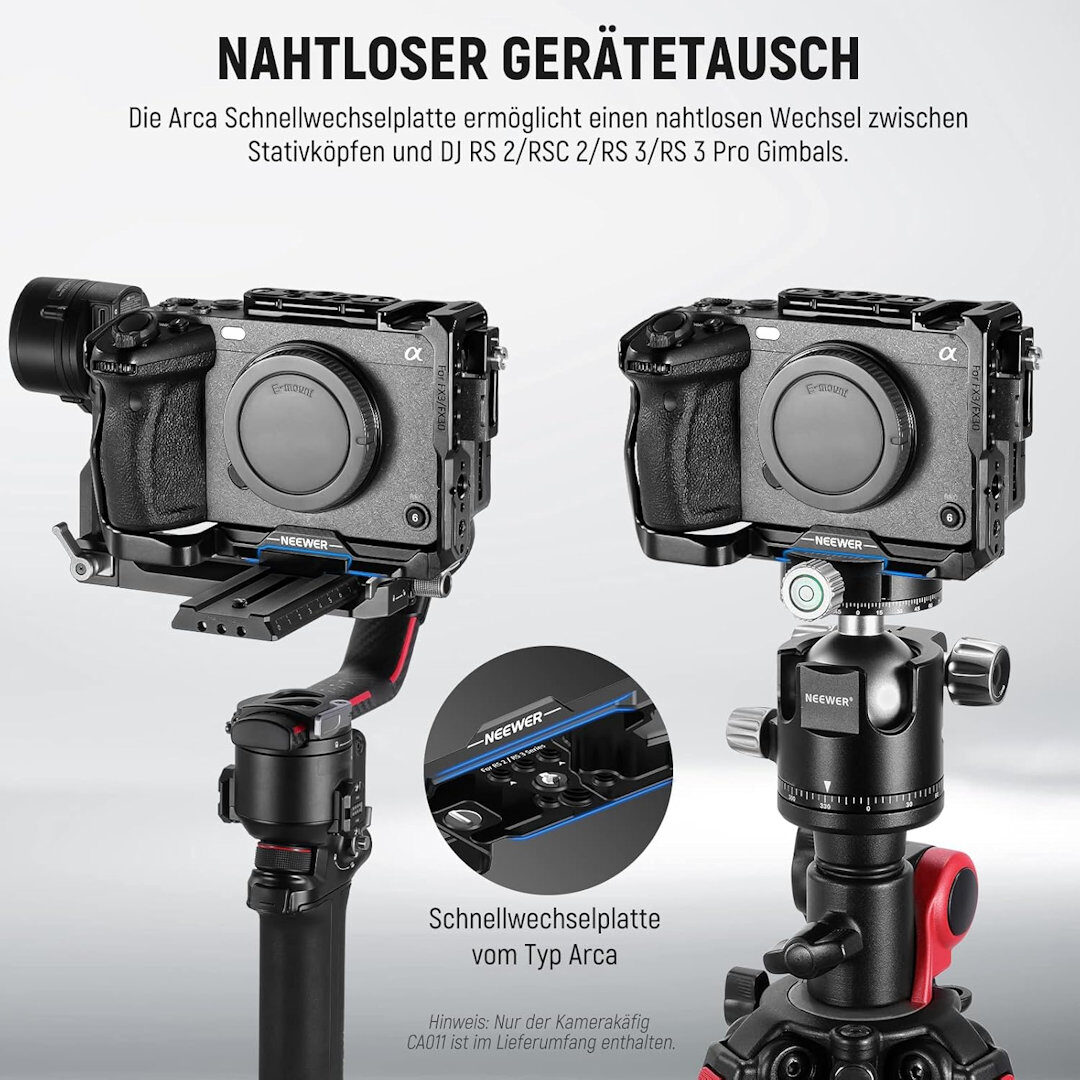- Arca type base for tripod head and gimbal: With a standard Arca base, the camera cage can be quickly mounted on any tripod head and video head with an identical mounting system. In addition, it is seamlessly compatible with DJI RS 2/RSC 2/RS 3/RS 3 Pro stabilizer for smooth cinema-quality video recording