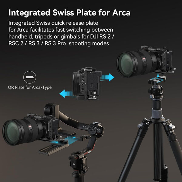 - Integrated Swiss plate for Arca: the integrated Swiss quick release plate for Arca makes it easy to quickly switch between handheld, tripods or gimbals for the DJI RS 2 / RSC 2 / RS 3 / RS 3 Pro shooting modes.