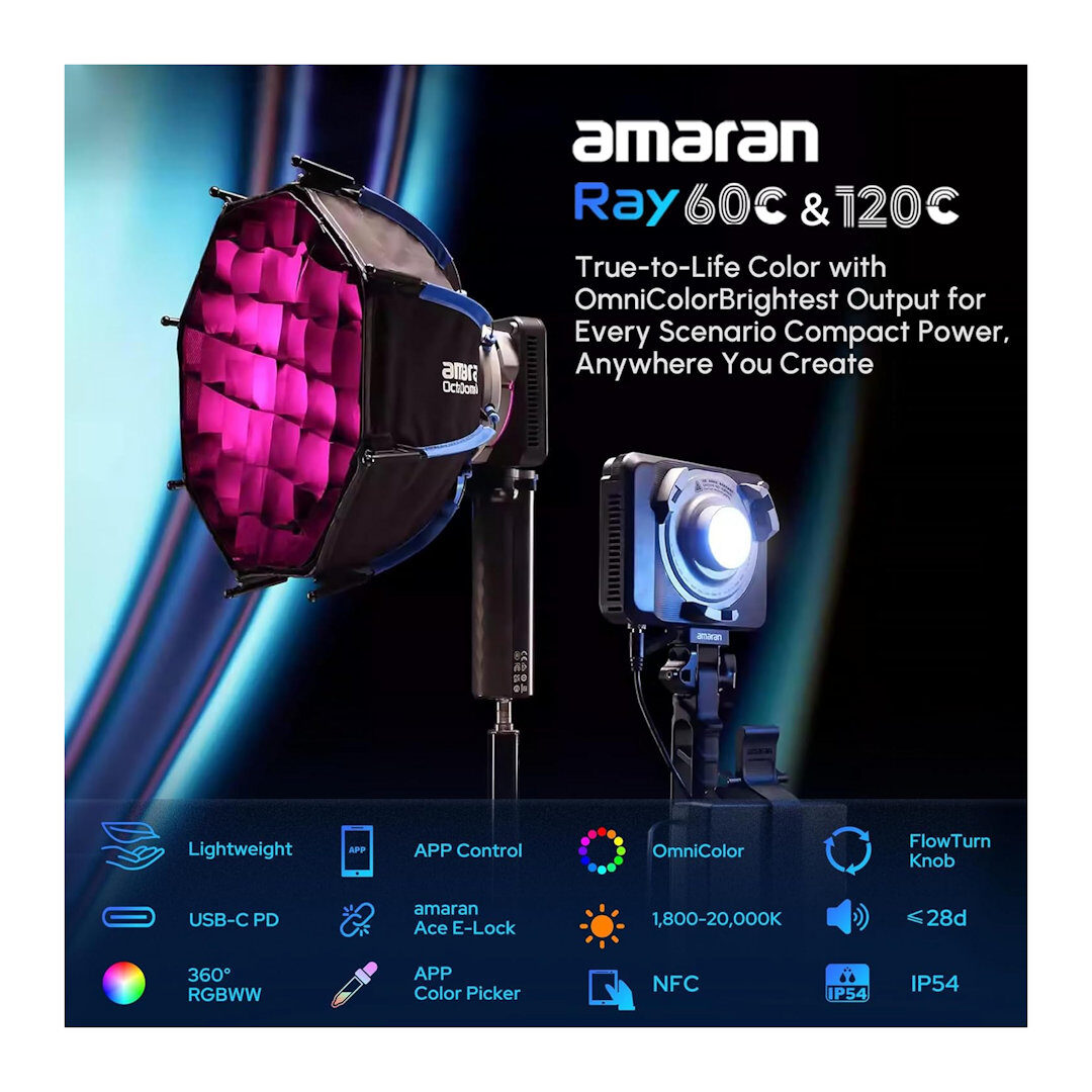 Keeping a convenient and compact design similar to the Ray 60c's, amaran introduces the Ray 120c RGB LED Monolight as a full-color point-source LED with higher output. The Ray 120c remains slim at 2" and lightweight at 1.3 lb, but it delivers 120W of power output for creators in need of more punch and mobility. The light is significantly brighter than amaran's 150c and has 85% of body reduction to better suit tight spaces and on-the-go workflows. Powered by the OmniColor light engine, the Ray 120c provides power flexibility and easy local/app control via FlowTurn knob and NFC configuration. Choose from an extended color temperature range of 1800-20,000K in CCT+ with high color accuracy, and access 360° full color control with HSI and RGB modes. Despite its compact design, the Ray 120c features a full-size Bowens mount, while offering Ace E-Lock compatibility and USB-C PD support. This light is easy to pack, mount, and carry with you. Essential accessories are included so the Ray 120c comes travel-ready for everything from outdoor spaces to studio setups.