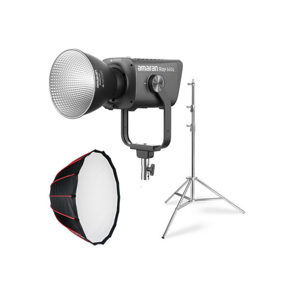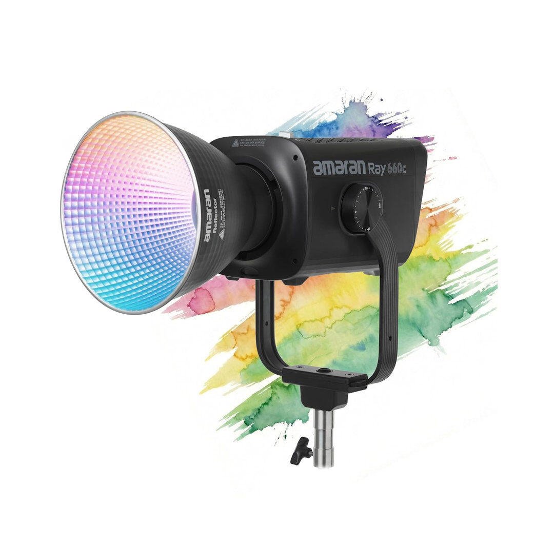 The full-color Ray 660c RGB LED Monolight is amaran's highest output COB light with 660W, OmniColor technology, and modern features. Whether you're lighting up subjects or filling expansive studios, the Ray 660c is a well suited streamlined, monolight-style LED. Find intuitive onboard and app management of settings via FlowTurn knob and NFC configuration, or opt for DMX control via USB-C by adding an optional adapter. Choose from an extended color temperature range of 1800-20,000K in CCT+ with high color accuracy, and access 360° full color control with HSI and RGB modes. The Ray 660c is IP54 dust and watersplash resistant, so it is built to withstand demanding environments. When it comes to flexibility, amaran has left no stone unturned with the inclusion of a convenient yoke and Bowens mount compatibility. The brand includes a reflector, a single power cable, and a case to give you a storage solution and faster setup between shoots.
